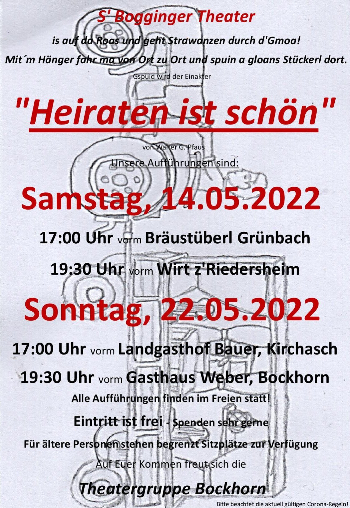 Die Werbung für den diesjährigen Einakter "Heiraten ist schön" kann anlaufen. Der offizielle Handzettel ist nun verfügbar. Jetzt können wir Theat'ler nur noch auf gutes Wetter an den beiden Spieltagen hoffen, so dass möglichst viele Zuschauer das Stück genießen können.