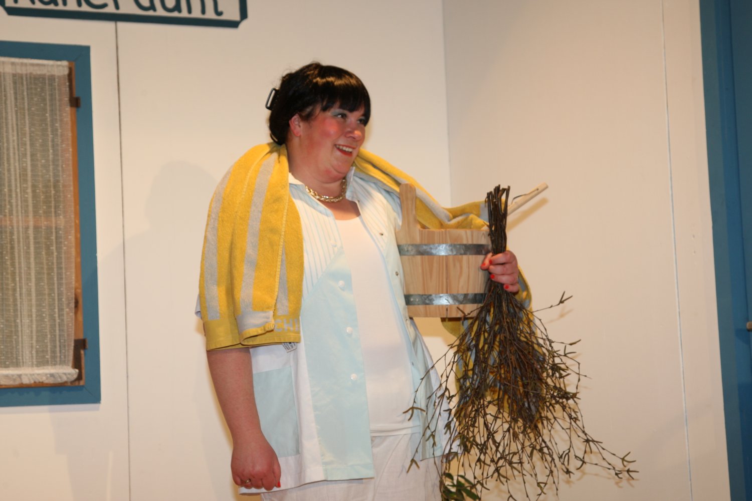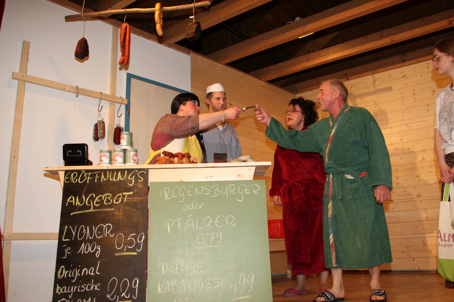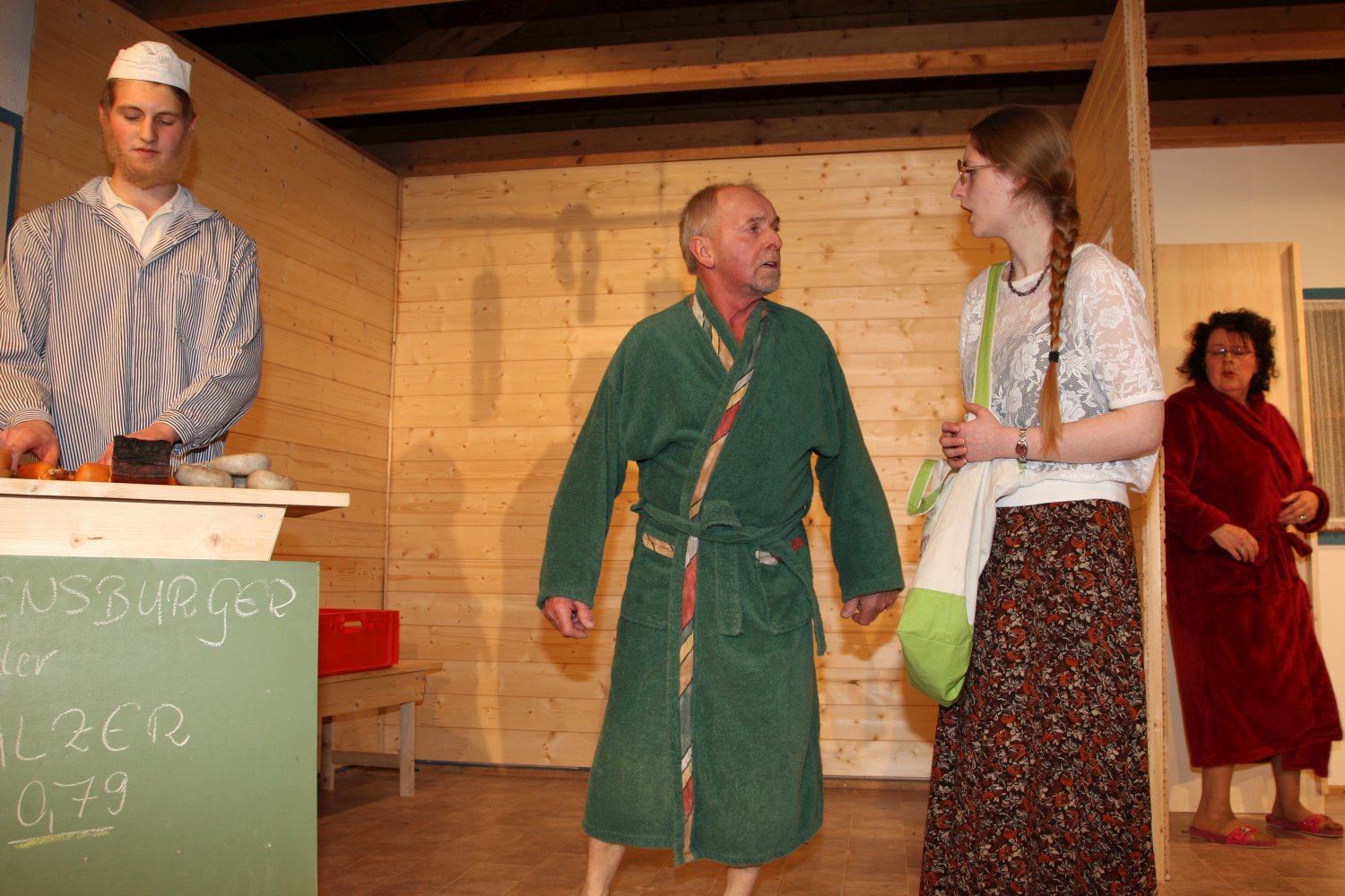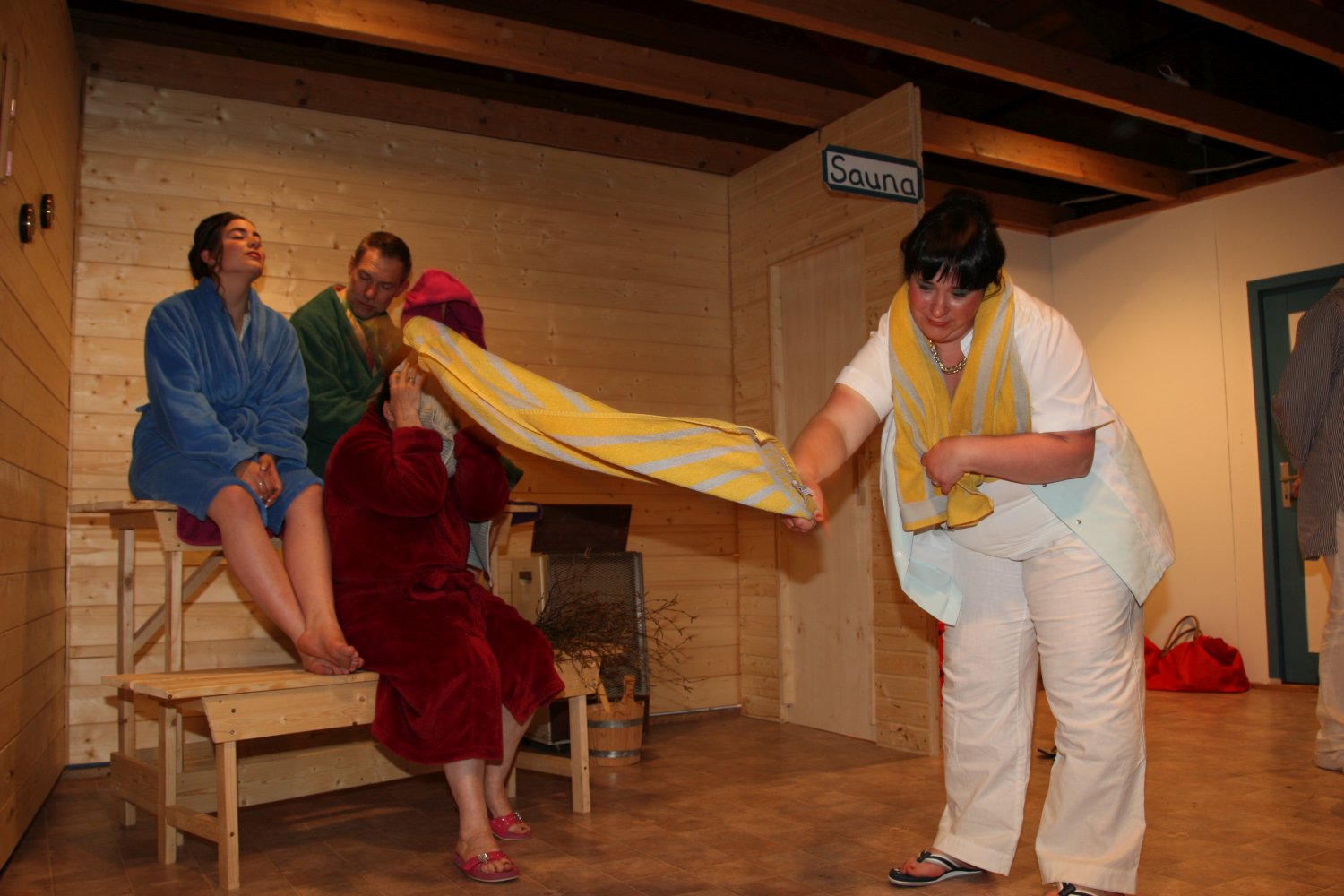 Der Gemeinderat möchte dem etwas verschlafenen Dorf zu mehr Attraktivität verhelfen und deshalb das leer stehende Schlachthaus zur Sauna umfunktionieren. Metzgermeister Fleischhauer hingegen beabsichtigt hier einen neuen Laden zu eröffnen. Obwohl noch keine der beiden Parteien im Besitz einer Genehmigung ist, beginnen sie bereits abwechselnd mit dem Einrichten. Die russischstämmige Olga wird dabei mal als Saunafachkraft, mal als Metzgereiverkäuferin angeheuert, was diese nicht sonderlich aus der Fassung bringt, solang der Vorrat an Wodka reicht. Während einerseits Schreinermeister Bernd und sein nicht gerade von Fleiß geplagter Stift Stefan für die Sauna am Hobeln und Schrauben sind, schafft Fleischhauer nebenher schon mal Schwarzwurst, Blut- und Leberwürste heran und benützt die bereits installierten Saunabänke kurzerhand als Ladentheke. Das kann natürlich nicht gut gehen und führt auf beiden Seiten zu erheblicher Verwirrung, wobei der als Werbefotograf angeheuerte feminine Sebastiano das Fass schier zum Überlaufen bringt. Aber Bürgermeisterin Gerlinde hat einen salomonischen Einfall... |