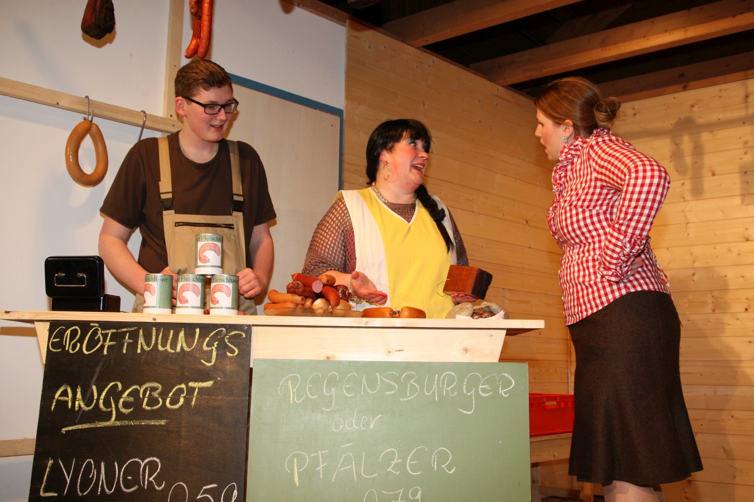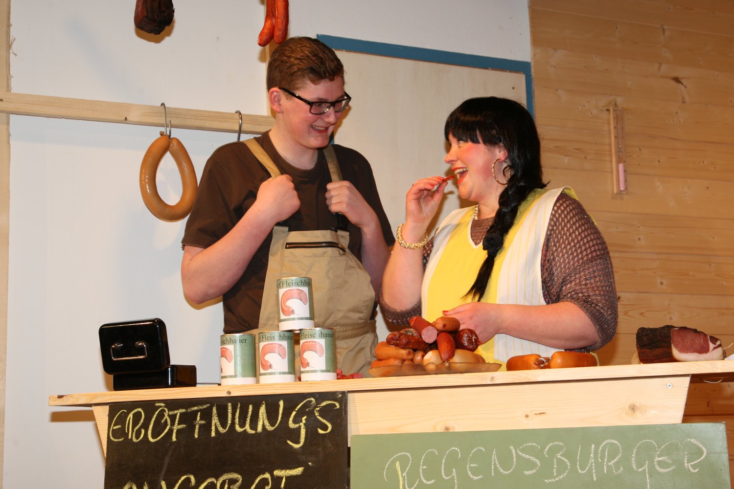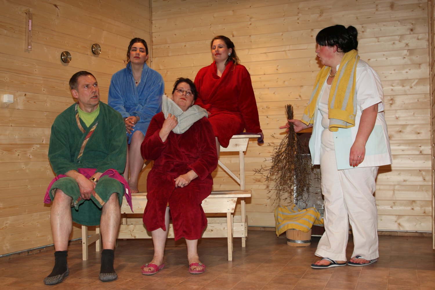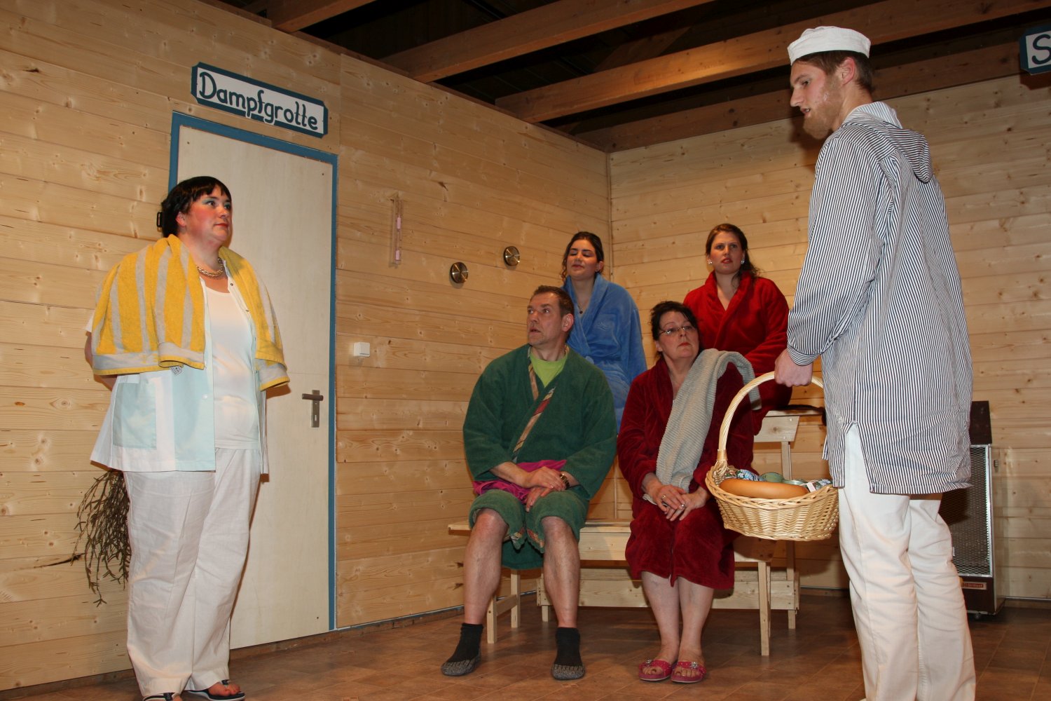 Der Gemeinderat möchte dem etwas verschlafenen Dorf zu mehr Attraktivität verhelfen und deshalb das leer stehende Schlachthaus zur Sauna umfunktionieren. Metzgermeister Fleischhauer hingegen beabsichtigt hier einen neuen Laden zu eröffnen. Obwohl noch keine der beiden Parteien im Besitz einer Genehmigung ist, beginnen sie bereits abwechselnd mit dem Einrichten. Die russischstämmige Olga wird dabei mal als Saunafachkraft, mal als Metzgereiverkäuferin angeheuert, was diese nicht sonderlich aus der Fassung bringt, solang der Vorrat an Wodka reicht. Während einerseits Schreinermeister Bernd und sein nicht gerade von Fleiß geplagter Stift Stefan für die Sauna am Hobeln und Schrauben sind, schafft Fleischhauer nebenher schon mal Schwarzwurst, Blut- und Leberwürste heran und benützt die bereits installierten Saunabänke kurzerhand als Ladentheke. Das kann natürlich nicht gut gehen und führt auf beiden Seiten zu erheblicher Verwirrung, wobei der als Werbefotograf angeheuerte feminine Sebastiano das Fass schier zum Überlaufen bringt. Aber Bürgermeisterin Gerlinde hat einen salomonischen Einfall...  |