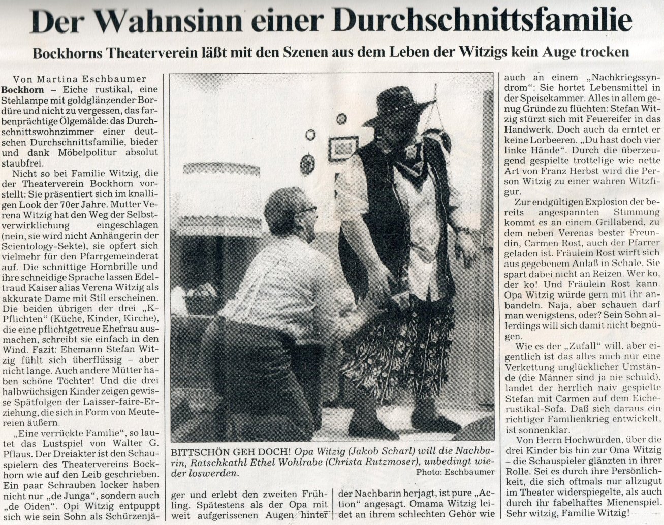 Es gibt bestimmt viele verrückte Familien, aber in dieser stimmt schon gar nichts: Der Vater, handwerklich völlig unbegabt, wird von keinem richtig ernst genommen, die Mutter, ohne Familiensinn, kümmert sich nur um die Kirche, die Kinder sind völlig respektlos, der Opa erfindet immer irgendein Klassentreffen, um nochmal so richtig ausgehen zu können, die Oma ist nicht mehr ganz „dicht“ und will immer zu einer Beerdigung. Selbst dem Pfarrer kann man nicht ganz glauben. Hier geht wirklich alles drunter und drüber. | |||||||||||||||||||||||||||||||